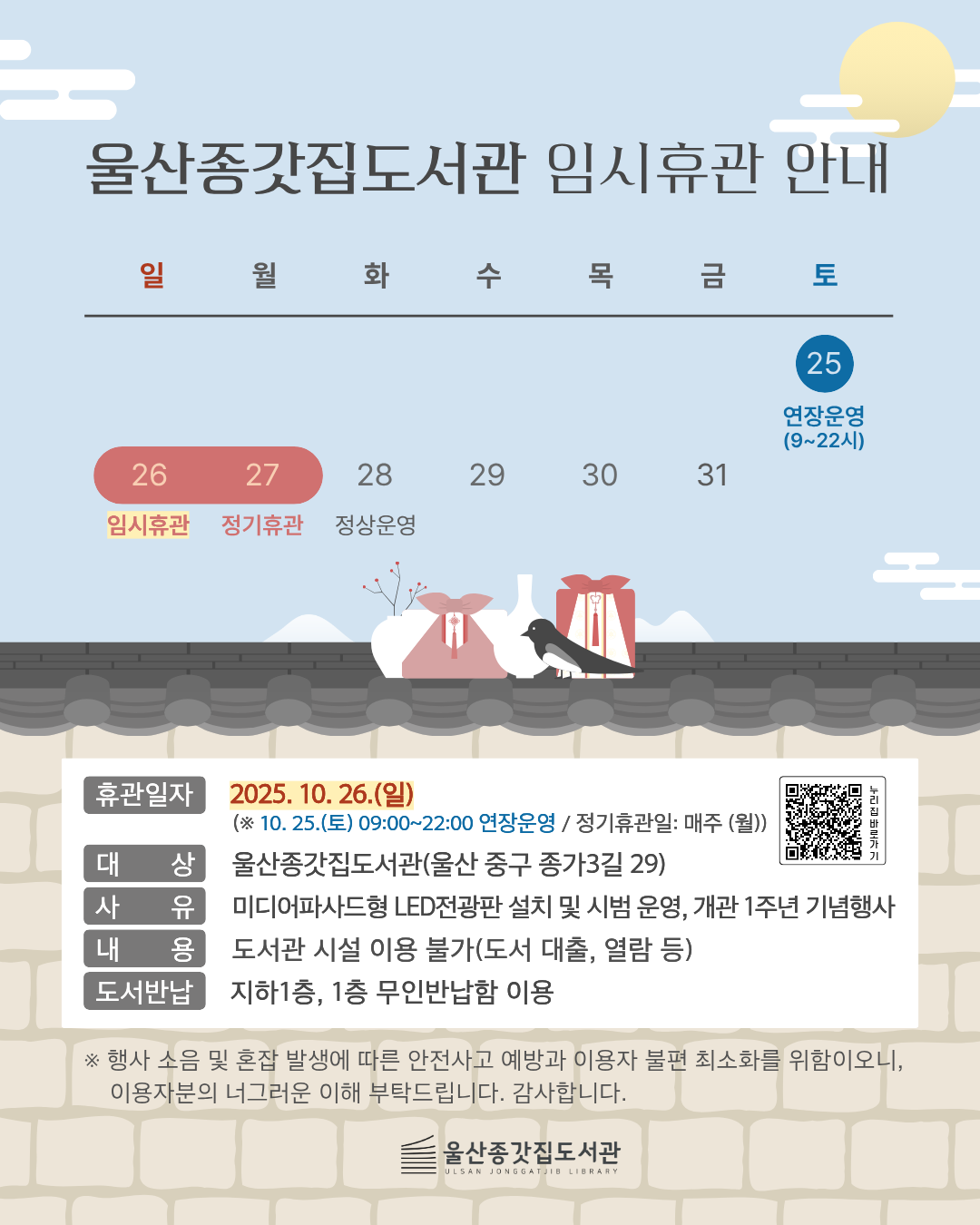 □ 울산종갓집도서관 임시휴관 안내 ○ 휴관일자: 2025. 10. 26.(일) ※ 10. 25.(토) 09:00~22:00 연장 운영 ○ 대상시설: 울산종갓집도서관(울산 중구 종가3길 29) ○ 사 유: 미디어파사드형 LED전광판 설치 및 시범 운영, 개관 1주년 기념행사 ○ 내 용: 도서관 시설 이용 불가(도서 대출, 열람 등) ○ 도서반납: 지하1층, 1층 무인반납함 이용