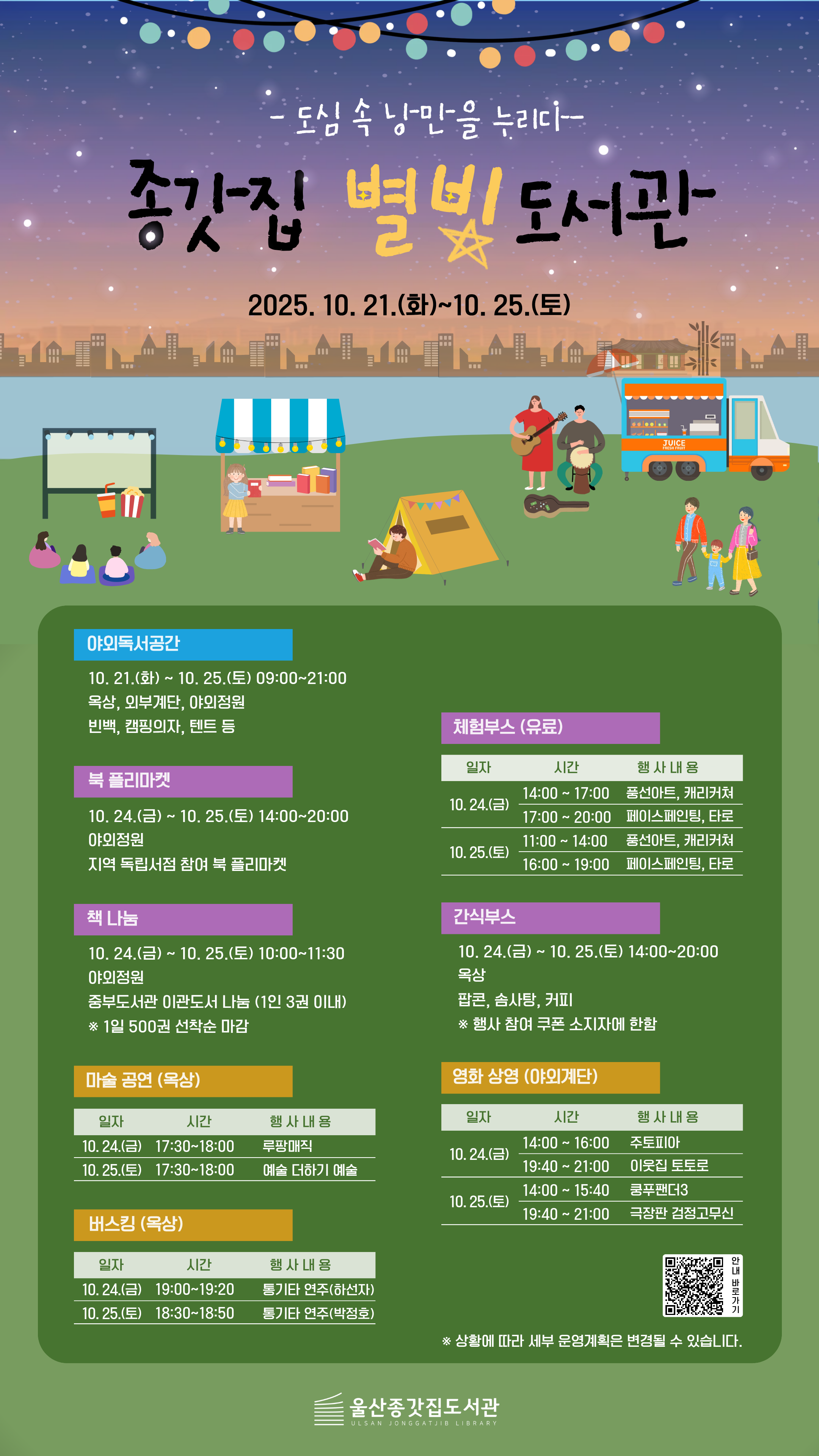 □ 「종갓집 별빛도서관」 행사 안내 ○ 기 간: 2025. 10. 21.(화)~10. 25.(토) <5일간> ○ 장 소: 울산종갓집도서관 내·외부 ○ 참여대상: 도서관 이용자 및 지역 주민 ○ 주요내용: 야외 독서공간 조성, 영화 상영, 공연, 부대행사 등