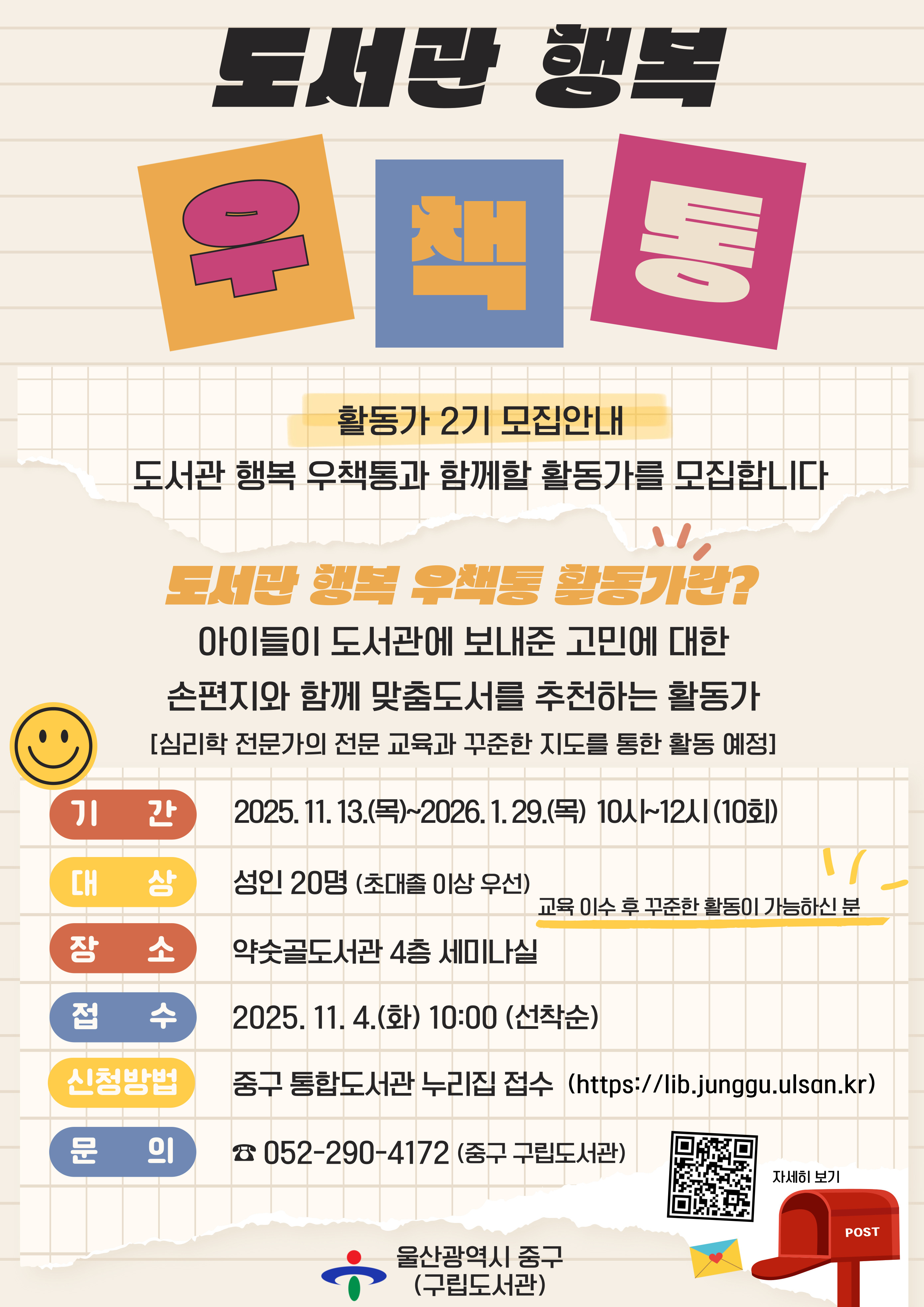 ○ 내 용: '도서관 행복 우책통' 활동가 2기 모집 및 양성 과정
