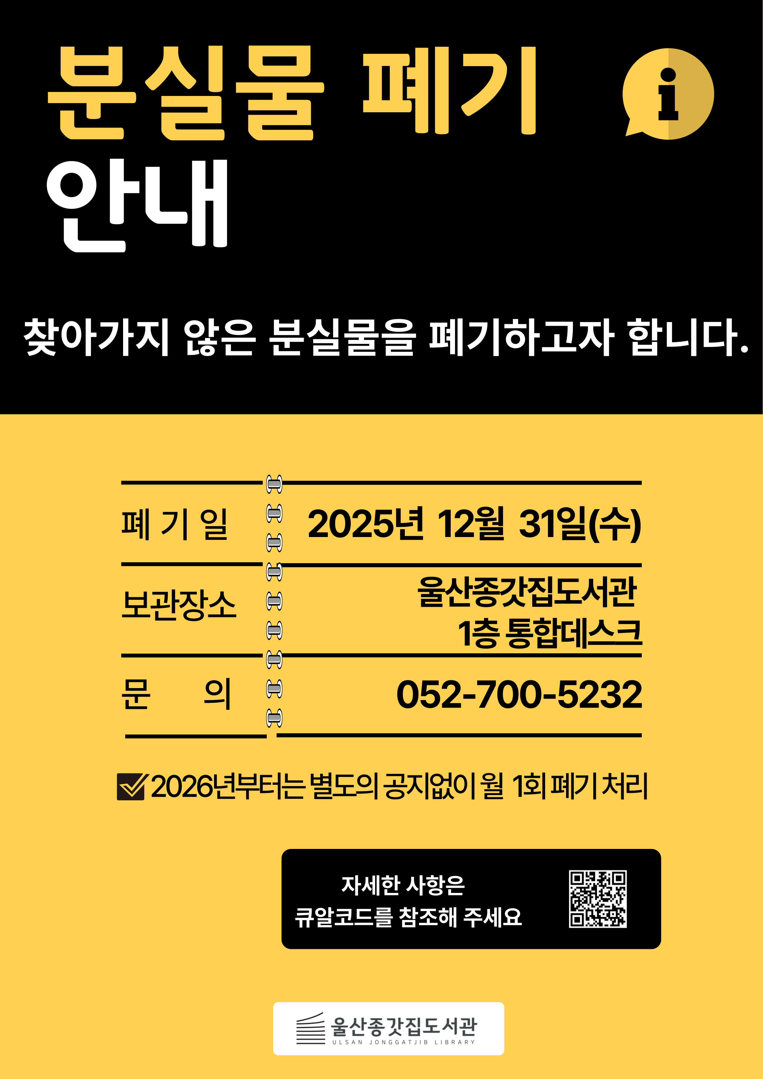 ○ 폐 기 일: 2025년 12월 31일(수) ○ 폐기 물품: 2025년 11월 30일(일)까지 습득 된 물품 ※현금, 귀금속, 전자 제품 등 귀중품 제외 ○ 보관 장소: 울산종갓집도서관 1층 통합데스크 ○ 문 의: 052-700-5232 ※2026년부터는 별도의 공지 없이 월 1회 폐기 처리