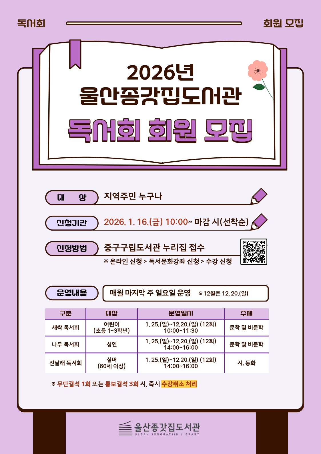 □ 2026년 울산종갓집도서관 독서회 회원 모집 ○ 운영기간: 2026. 1. 25.(일)~12. 20.(일) ※ 매월 마지막 주 일요일 운영, 12월은 12. 20.(일) 운영 ○ 운영대상: 지역주민 누구나 ○ 운영내용: 새싹 독서회(어린이), 나무 독서회(성인), 진달래 독서회(실버) ○ 신청기간: 2026. 1. 16.(금) 10:00~마감 시까지(선착순) ○ 신청방법: 중구구립도서관 누리집 접수(온라인 신청 > 독서문화강좌 신청 > 수강 신청) 구분 | 대상 | 운영일시 | 주제 | 새싹 독서회 | 어린이(초등 1~3학년) | 1.25.(일)~12.20.(일) 10:00~11:30 | 문학 및 비문학 | 나무 독서회 | 성인 | 1.25.(일)~12.20.(일) 14:00~16:00 | 문학 및 비문학 | 진달래 독서회 | 실버(60세 이상) | 1.25.(일)~12.20.(일) 14:00~16:00 | 동화, 시 |
