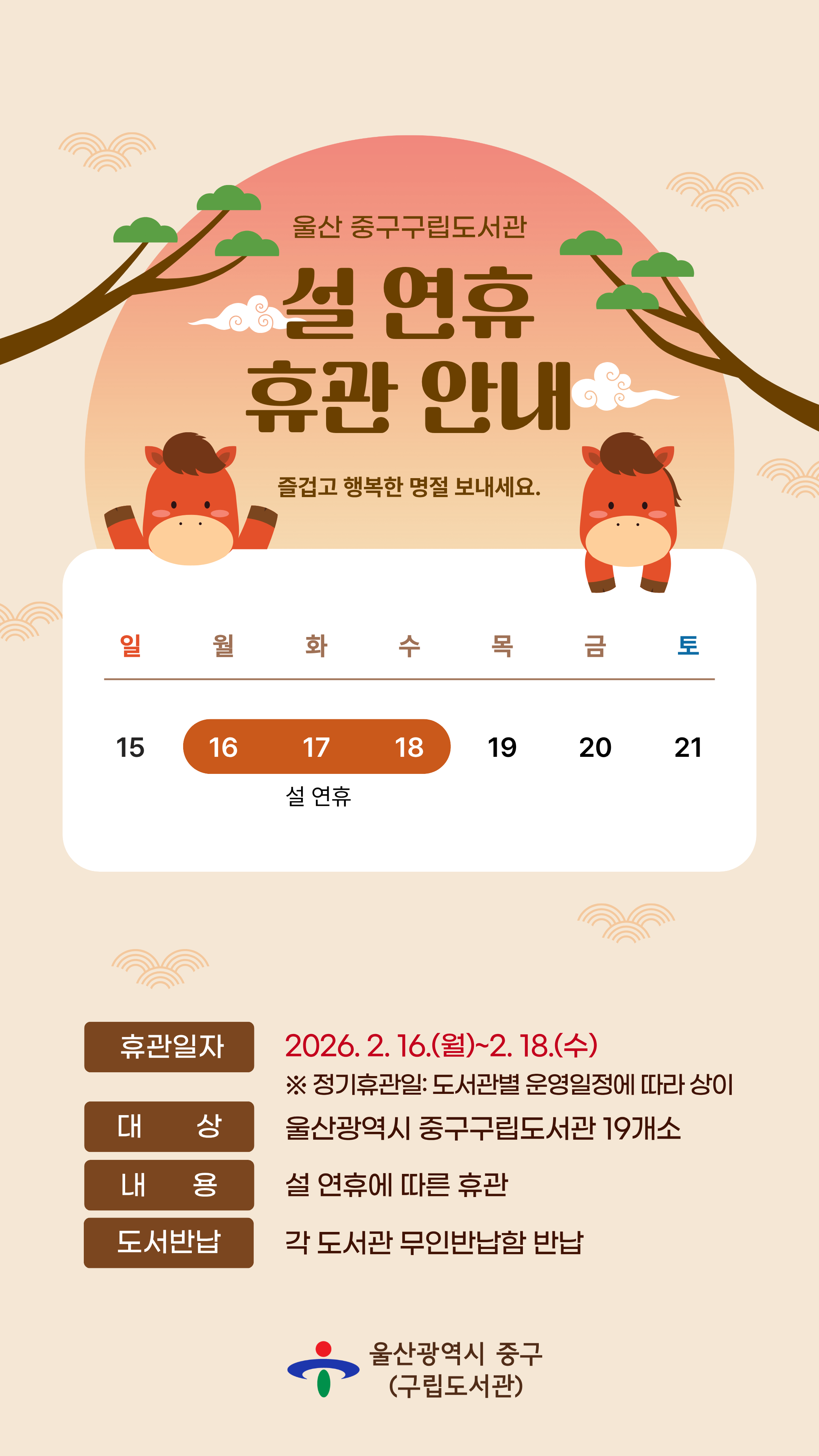□ 중구구립도서관 설 연휴 휴관 안내 ○ 휴관일자: 2026. 2. 16.(월)~2. 18.(수) ※ 정기휴관일: 도서관별 운영일정에 따라 상이 ○ 대 상: 울산광역시 중구구립도서관 19개소 ○ 내 용: 설 연휴에 따른 휴관 ○ 도서반납: 각 도서관 무인반납함 반납