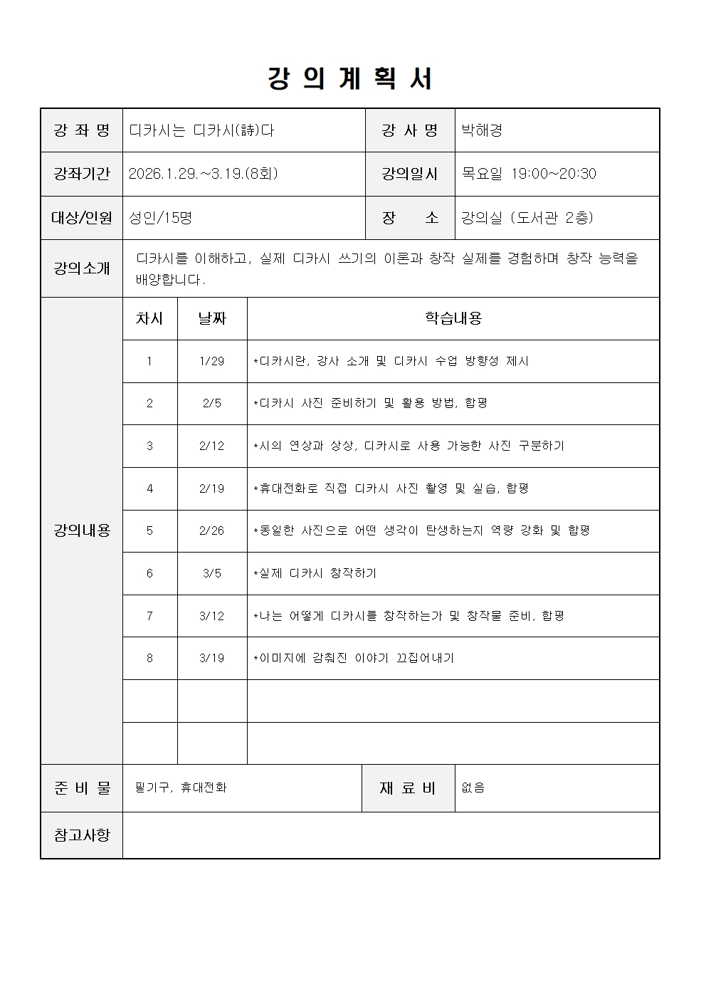 ※ 모든 강좌는 도서관 운영상황에 따라 강사, 일정, 장소 및 운영방법이 변경되거나 폐강될 수 있음.