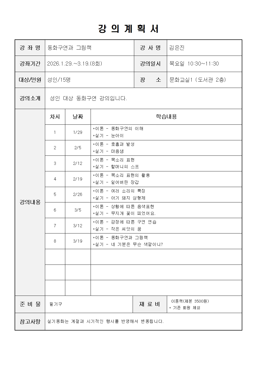 ※ 모든 강좌는 도서관 운영상황에 따라 강사, 일정, 장소 및 운영방법이 변경되거나 폐강될 수 있음.