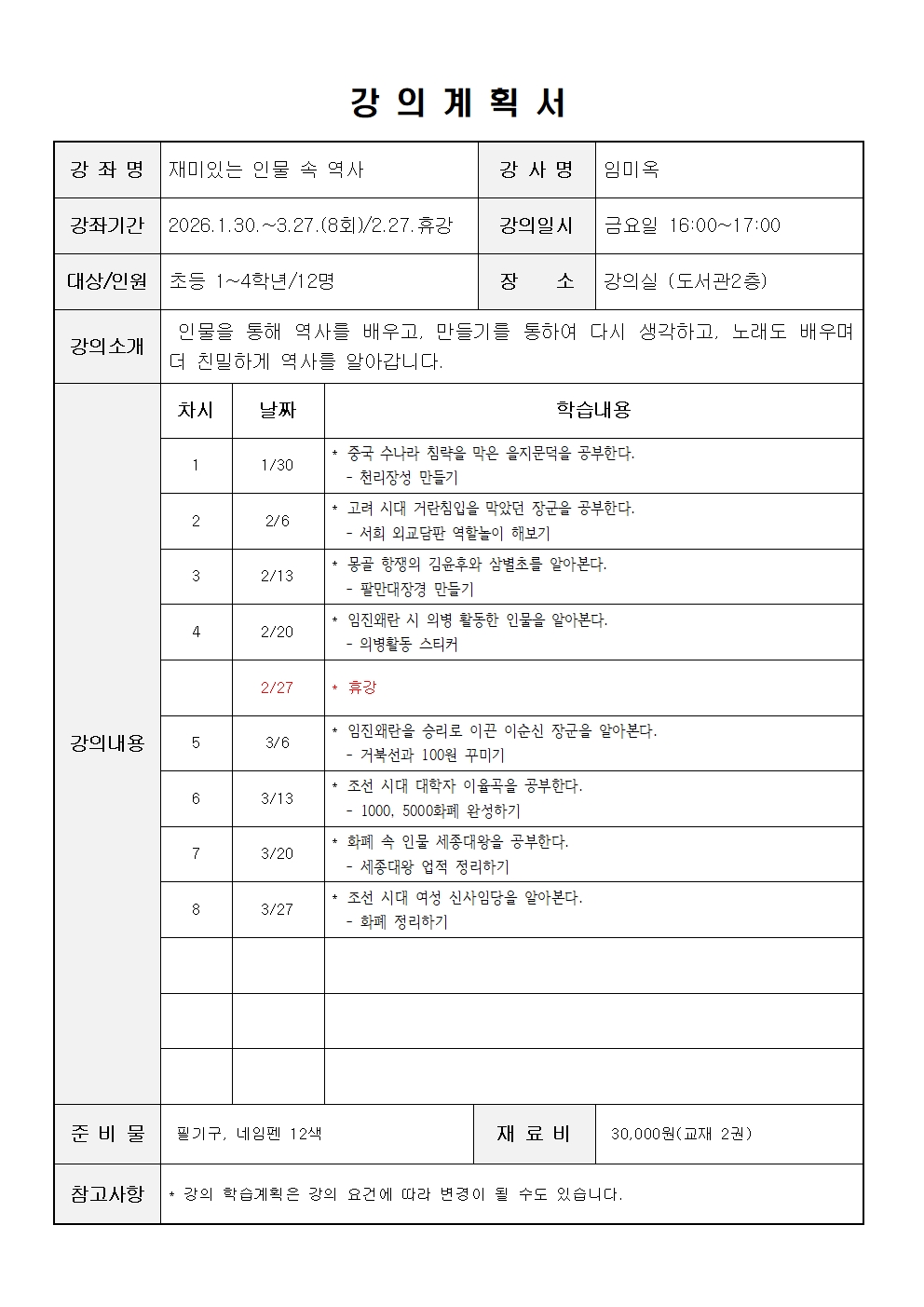 ※ 모든 강좌는 도서관 운영상황에 따라 강사, 일정, 장소 및 운영방법이 변경되거나 폐강될 수 있음.